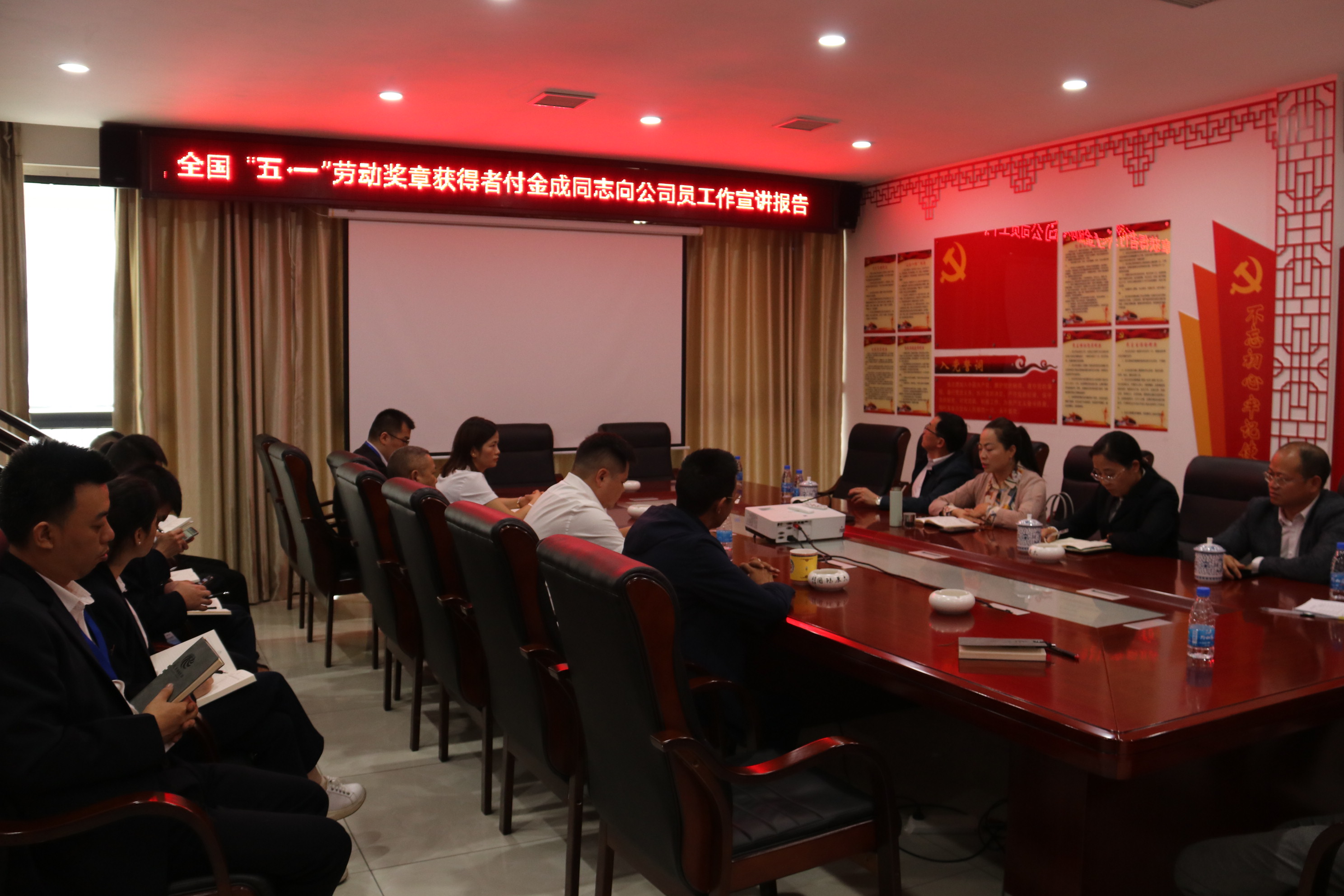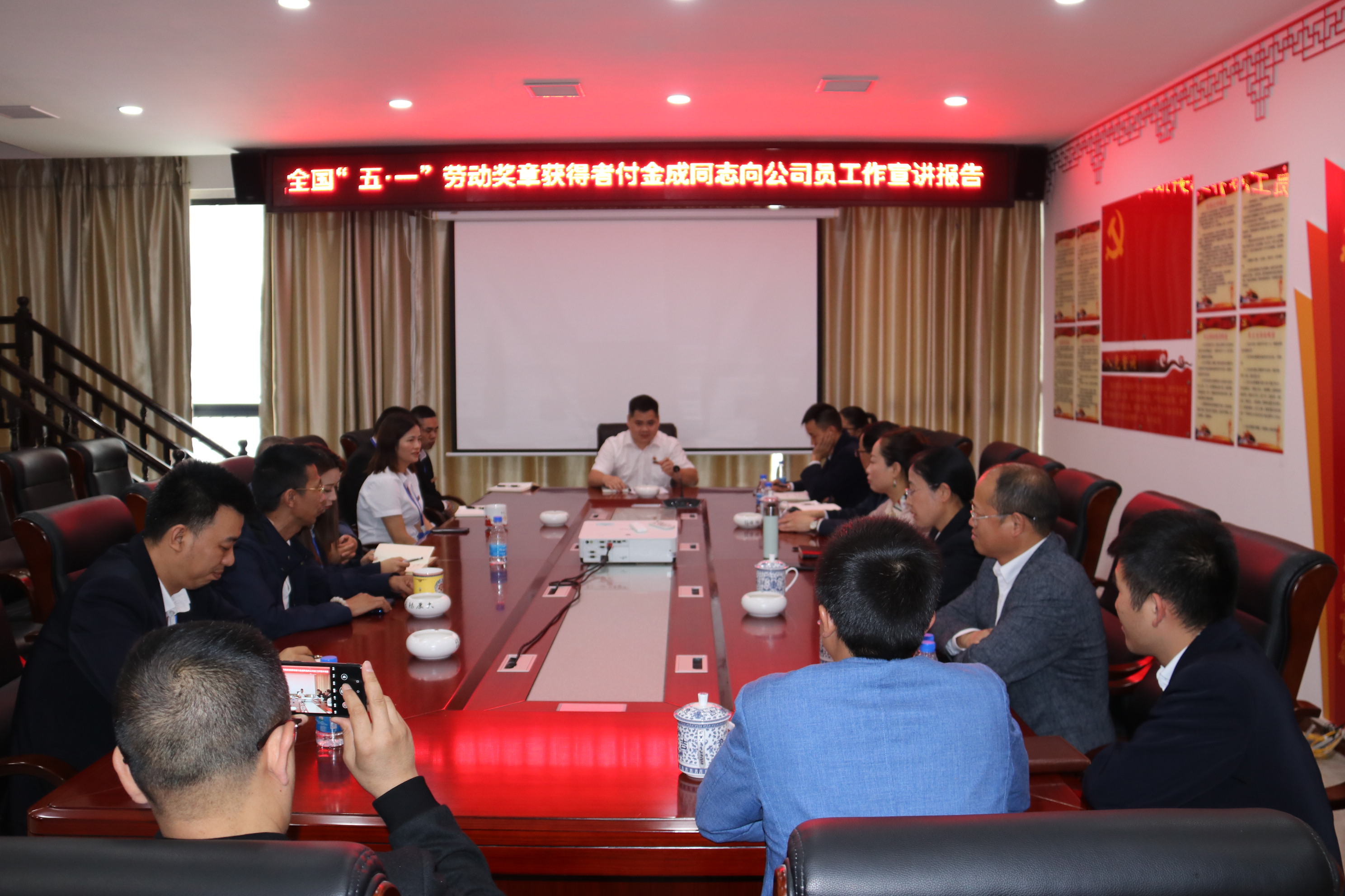 2021530日下午,贵州通建建设工程有限公司在公司会议室举行全国五一劳动奖章获得者宣讲报告会,县人大常委会副主任、县工商联主席邰胜英、县委两新工委专职副书记杨旭、县委统战部副部长潘承渊、县总工会党组书记龙懿、县住建局副局长陆正彩等和贵州通建建设工程有限公司副董事长付清武、总经理李祖培以及公司全体员工,听取了荣获全国五一劳动奖章”荣誉称号的付金成同志的宣讲报告,并与付金成同志进行座谈、互动交流。